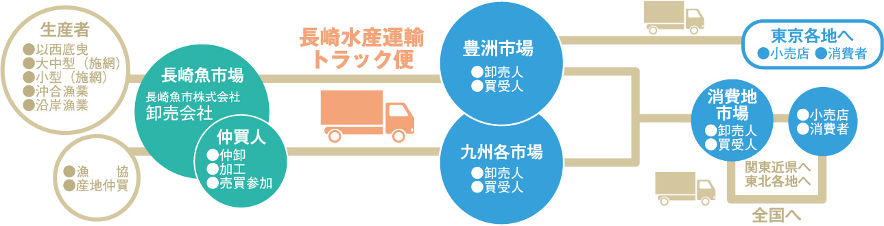そこからさらに関東近辺や全国をカバーするネットワーク業者と連携し、長崎の新鮮な海の幸をスピーディに安全に全国各地へとお届けしています。